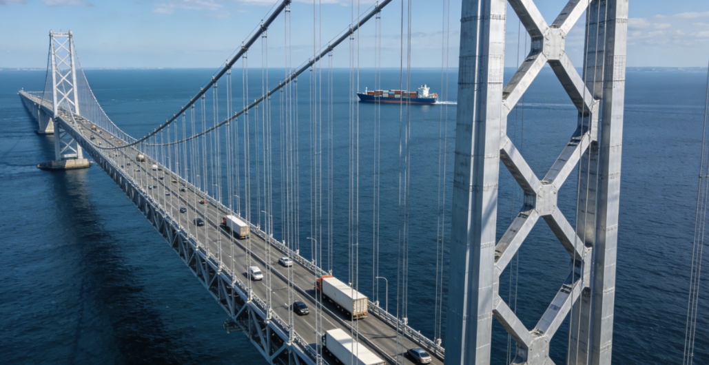 Conquistando águas ultralargasAproveitando a elevada resistência do aço e a eficiência dos sistemas de cabos, o vão principal pode facilmente ultrapassar1.500 metros, chegando mesmo a ultrapassar os 2.000 metros., abrangendo importantes canais de navegação com um número mínimo de cais em águas profundas, maximizando assim a segurança da navegação e a preservação da ecologia marinha.